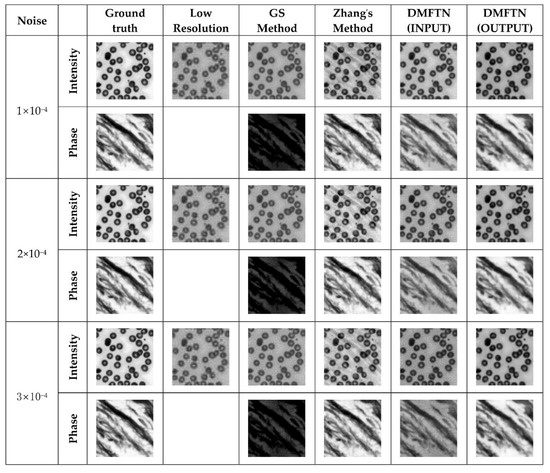 Considering the existence of Gaussian noise in the image acquisition process of Fourier ptychographic microscopy imaging system, the mean value is 0 and the standard deviation is Gaussian noise in the simulation test set. The peak signal-to-noise ratio (PSNR) and structural similarity (SSIM) are used to compare the reconstruction quality. The DMFTN method is compared with the traditional alternating projection method and the neural network method. As shown in Figure 10, Table 1 is the index value of different image reconstruction results under the same noise.