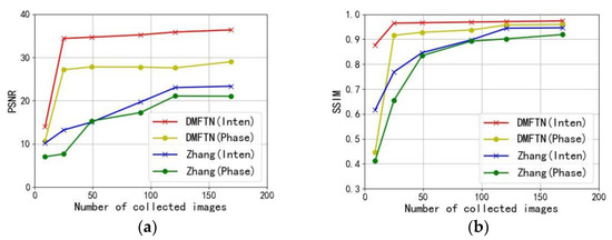 Reconstruction quality curve with reduced number of acquired images: (a) PSNR plot of the reconstruction results; (b) SSIM plot of the reconstruction results.