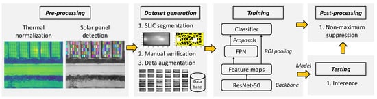 The workflow of our anomaly detection algorithm based on thermal images. In the pre-processing phase, the thermal images are normalized and the solar panels are detected. The latter are fed to SLIC segmentation to generate positive samples of hotspots. These are manually checked and the dataset is augmented using several operations (rotations, crops, contrast, etc.). Training is based on a region-based CNN, using a Feature Pyramid Network (FPN) as region proposal network and a ResNet-50 as backbone. Finally, post-processing comprises non-maximum suppression to filter out ‘duplicate’ (i.e., overlapping) detections.