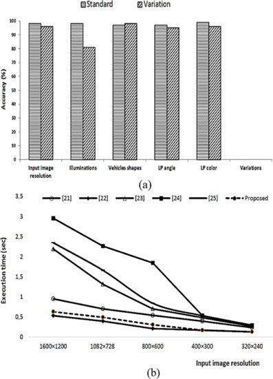 To validate the robustness of our developed LPD algorithm, in Figure 5a we show the license plate detection accuracy for five important variations, which are (i) image resolution, (ii) illumination variation, (iii) vehicle shapes, (iv) license plate angle, and (v) license plate color. For each of the variations, as shown in Figure 5a, there are two towers. The first tower depicts the standard conditions as provided by the PKU dataset, while the second tower shows the performance of the proposed algorithm when the relevant parameter is varied. From Figure 5a, a few important observations are in order: