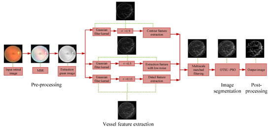The flow chart of the algorithm for blood vessel segmentation in this paper is shown in Figure 1. As shown in Figure 1, a retinal segmentation method based on multi-scale joint optimization strategy is mainly divided into four stages: image pre-processing, vascular feature extraction, image multi-threshold segmentation, and image post-processing. Firstly, we use MSR to adjust the brightness of the image and reduce noise, and the green channel is extracted as the original image for subsequent processing. Secondly, the Multi-scale Gaussian matched filtering method is proposed to enhance the contrast of the images and extract the features of the blood. Then, PSO is used to optimize OTSU three thresholds for image segmentation. Finally, the binarized image is processed by breakpoints connection, denoising and edge contour removal. To illustrate the various steps of the algorithm in detail, Figure 2 shows the amplification images of all the output images in important steps.