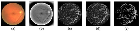 - Hoover, A.; Kouznetsova, V.; Goldbaum, M. Locating Blood Vessels in Retinal Images by Piecewise Threshold Probing of a Matched Filter Response. IEEE Trans. Med. Imaging 2000, 19, 203–210. [Google Scholar] [CrossRef] [Green Version]