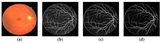 Retinal vascular image segmentation is an important topic in medical image research, which can effectively assist doctors in the clinical diagnosis and treatment of rapid cardiovascular diseases, diabetes and other diseases. In recent years, many scholars have studied retinal vascular image segmentation and achieved some results. However, due to the complexity of retinal images and the influence of noise and light factors in the image acquisition process, accurate retinal vascular image segmentation is still a challenging task [,,]. Two-dimensional color fundus images and 3D Optical Coherence Tomography (OCT) images are the commonly used images for ophthalmic diseases. OCT technology can provide high-resolution retinal images. However, OCT is expensive, images are difficult to acquire, and images need to be registered for vessel segmentation. Color fundus copy is a non-invasive and painless image of the inner wall of the eye taken at different angles using a fundus camera. More importantly, it allows direct visualization of retinal vascular lesions and other lesions such as microaneurysms, hemorrhages, neovascularization, hard exudates, and absorbent cotton spots. Therefore, we choose color fundus images for retinal vessels segmentation studies [,,].