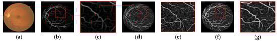 Comparison of multi-scale and single-scale vascular extraction. (a) original image; (b) (c) Detail amplification of (d) (e) Detail amplification of (f) multi-scale fusion vascular extraction image; (g) Detail amplification of multi-scale.