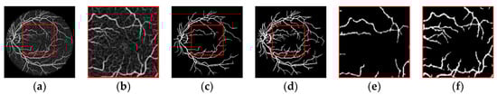 Comparison of multi-threshold and single-threshold segmentation results. (a) Multi-scale matched filtering figure; (b) Detail amplification of Multi-scale matched filtering; (c) Single-threshold segmentation figure; (d) Three-threshold segmentation figure; (e) Detail amplification of Single-threshold segmentation; (f) Detail amplification of Three-threshold segmentation.