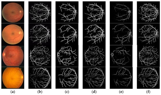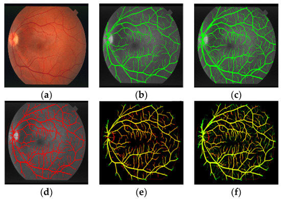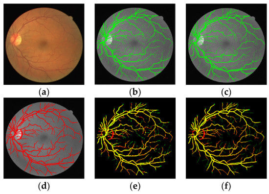 Figure 6a and Figure 7a are the original images of the DRIVE and STARE datasets. Figure 6b and Figure 7b are the segmentation results of the proposed method, which are displayed in red. Figure 6c and Figure 7c are the results made by the first expert, which are displayed in green Figure 6d and Figure 7d are the results made by the second expert, which are displayed in green. Figure 6e,f and Figure 7e,f are the differences between the proposed method and the segmentation results of the first expert and the second expert. According to the color scheme of Figure 6 and Figure 7, the yellow represents the vascular pixels that are correctly segmented. As demonstrated in Figure 6 and Figure 7, the segmentation results on DRIVE and STARE datasets show that there are some red parts, indicating that the proposed method can segment more small blood vessels while ensuring the integrity of the main blood vessels.