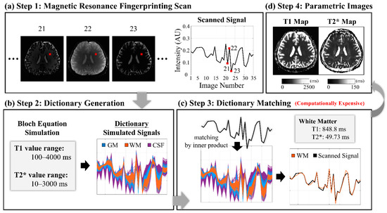 - Ma, D.; Gulani, V.; Seiberlich, N.; Liu, K.; Sunshine, J.L.; Duerk, J.L.; Griswold, M.A. Magnetic Resonance Fingerprinting. Nature 2013, 495, 187–192. [Google Scholar] [CrossRef] [Green Version]