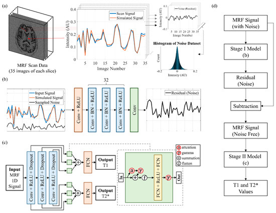 Figure 2d was the flowchart of the successive process of our model. The MRF signals with noise were first inputted to the stage I model to predict the noise. The denoised MRF signals were obtained by subtracting the predictive noise from the MRF signals with noise. Then, the denoised signals were inputted to the stage II model for outputting the T1 and T2* values.