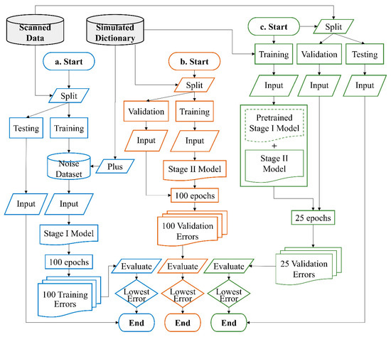 Figure 3b indicates the workflow for training the models with different structures, namely, WPDaCNN, PDCNN, DCNN, and SCNN. The simulated dictionary was split into training and validation datasets according to the division described in the Section 2.3. Subsequently, each model was trained for 100 epochs, and the one with the lowest error for the validation dataset was selected as the optimal model.