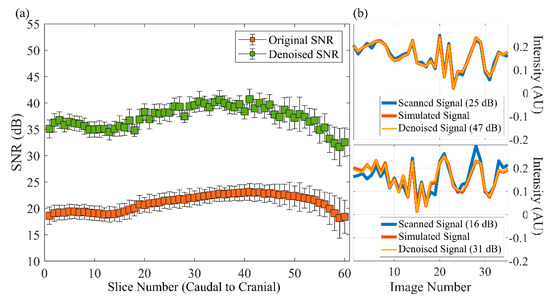 Figure 4a displays the corresponding SNR before and after denoising. The SNR varied from slice to slice, with lower SNRs in the cranial and caudal portions and higher SNRs in the middle. Figure 4b contains two examples of the scanned signal after denoising. The noise was effectively removed after denoising, and the SNR increased (25 dB vs. 47 dB and 16 dB vs. 31 dB). Table 1 presents the SNR and statistics before and after the denoising by the DnCNN for the training and testing datasets. The results for various tissue types were obtained after applying the tissue masks that were created by the automatic and manual segmentation mentioned in the Section 2.3. The SNRs in both the training and testing datasets increased, and the increases after denoising were statistically significant (p < 0.001). The SNRs of GM and WM were similar, whereas the SNR of CSF was lower than that of GM and WM. Regarding the differences in mean SNR between the training and testing datasets, the p values were 0.40 and 0.32 for the original and denoised SNRs, respectively. This result suggested that the mean SNRs of the training and testing datasets were not significantly different, either before or after denoising. Therefore, the model performed well in the testing dataset.