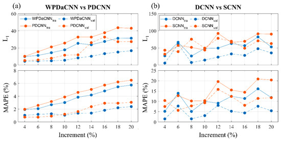 Performance of pyramid models trained under different dictionary increments. The solid line is the model prediction by training data, and the dashed line is that of the testing data. (a) L1 and MAPE of the WPDaCNN and PDCNN models. (b) L1 and MAPE of the DCNN and SCNN models.