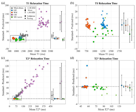 Bland-Altman plot for mean T1 and T2* relaxation times of 32 subjects (18 with MS lesions) for the whole brain and different tissues. (a,c) Plot for all tissues. (b,d) Cropped views of GM, WM, and MS lesion shown in (a) and (c).