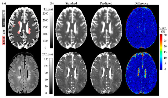 Magnetic resonance fingerprinting parametric maps of a single slice in an MS patient matched by the simulated dictionary (standard) and predicted by the proposed model. (a) Top is the tissue masks; bottom is the FLAIR. (b) Standard maps by dictionary matching, predicted maps by the proposed two-stage model, and difference maps between them.