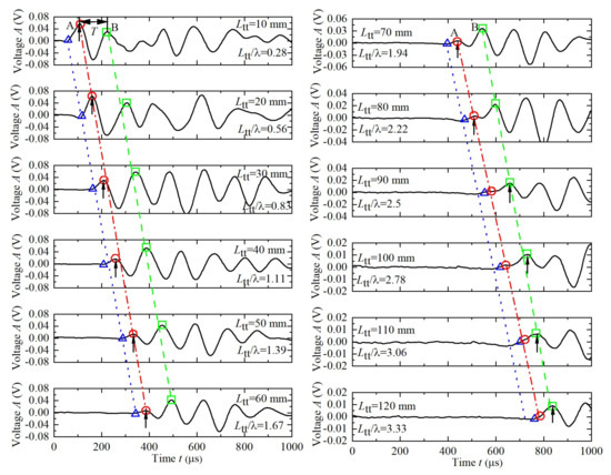 The received waveforms of the twelve samples measured at f = 5 kHz are shown in Figure 4. At this test frequency, the wave number Ltt/λ are in the range of 0.28 to 3.33, in which λ is wave length (λ = VS/f). These waveforms depict the characteristic points including the initial arrival point (triangle), visually-identified first peaks (upward arrow), real first peaks (point A, circle) and real second peaks (point B, rectangular). The initial arrival point is determined by the zero amplitude after the first bump on received waves (i.e., the I3 point in Figure 1b) as proposed by [16,31]. It can be seen that there is a marked tendency for point A to attenuate gradually with the increase of Ltt. Point A can be easily identified for Ltt ≤ 50 mm (Ltt/λ ≤ 2.22), increasingly difficult to identify for Ltt = 60, 70, and 80 mm and fail to identify for Ltt > 80 mm. When Ltt > 80 mm, the visually-identified first peaks are in fact the second peaks, not the real first peaks.