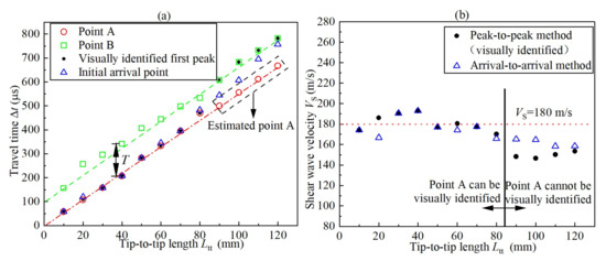 The Δt and VS were determined by the peak-to-peak approach using the visually-identified first peaks and the arrival-to-arrival approach using the visually-identified initial arrival points (i.e., I3 point) respectively. The results are shown in Figure 5a,b respectively. For Ltt ≤ 80mm, the two aforementioned approaches afford practically identical Δt and VS except for the case of Ltt = 20mm, where strong near field effect with a clear traverse waveform emerges before the S-wave arrival (see Figure 4). The VS is distributed within a limited extent with its average value of 180 m/s. The travel time lines corresponding to VS = 180 m/s are extended to evaluate real initial arrival points and real first peaks for Ltt > 80mm and they are shown in Figure 4 and Figure 5a with blue triangle and red circle respectively. Clearly, for Ltt > 80mm, the two approaches tend to overestimate Δt and underestimate VS. Assuming the real VS = 180m/s, the average relative errors (= (measured VS − real VS)/real VS × 100%) are approximately −17% and −10% for the peak-to-peak approach and arrival-to-arrival approach, respectively. In this study, arrival-to-arrival approach seems better than the peak-to-peak approach when the first peak cannot be correctly distinguished.