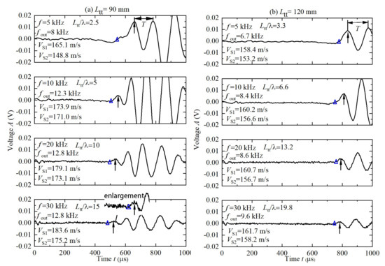 in which Δt is real travel time and Δt+T is visually-identified travel time with an error of T because of attenuation. According to Figure 5a, the period T maintains almost constant at 100 μs under f = 5 kHz for various Ltt. According to Equation (2), because Δt increases with Ltt, the relative error will decrease with Ltt. It agrees well with results of peak-to-peak approach given in Figure 5b. The deviation of arrival-to-arrival approach from Equation (1) is presumably attributed to the complexity of waveform around the S-wave arrival: a slight reverse occurs before the arrival of S-wave when Ltt ≥ 80 mm (see Figure 4). This slight reverse is possibly resulting from the light boundary reflection of P wave under long test distance [24,33].