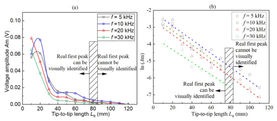 Figure 7 shows the relationships of the received voltage amplitude (Am) of the real first peak A against the test length Ltt at the four frequencies in two kinds of scales. It can be seen that Am of real first peak A decreased significantly with the increase of Ltt. The received voltage amplitude (Am) of the real first peak A is entirely below 0.08 V, which is considerably much smaller than the input voltage amplitude 5 V. This significant attenuation mainly arises from the factors including transformation between voltage and mechanical wave, bender element–soil interactions, sample absorption, and dispersion in surrounding air/materials. The critical value for the identification of first peak is approximately 0.002 V. The linear ln(Am) versus Ltt relationships shown in Figure 8 indicate the attenuation following the exponential relationship. A decreasing trend in Am with test frequencies f is observed, except for f = 10 kHz which approaching the resonant frequency fout.
