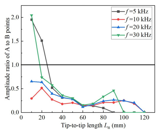 Figure 7b shows the amplitude ratio of point A to point B, i.e., real first peak to real second peak. The ratios are primarily smaller than 1.0, indicating the amplitude of point A is smaller than point B. The ratios generally decrease with Ltt, indicating that point A attenuates more significantly than point B as Ltt increases. This feature is also reported in [26]. It is possibly related to the frequency components of the waveform involved: point A contains higher frequency components, thereby exhibiting more remarkable attenuation. However, this hypothesis needs to be tested with more information.