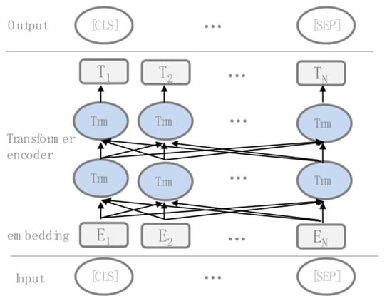 BERT makes use of Transformer, an attention mechanism that learns contextual relations between words (or sub-words) in a text. The BERT model proposed a new pre-training target: the masked language model (MLM). The models structure is shown in Figure 2. MLM randomly selects various words to mask, with the purpose to predict the masked portion based on the context non-masked words in the sequence, the MLM can access future context information due to the bidirectional feature provided by the Transformer architecture. In addition, BERT performs the next sentence prediction task, and the model receives pairs of sentences as input and learns to predict if the second sentence in the pair is the subsequent sentence in the original corpus.