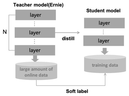 The BERT model mainly focuses on words or more fine-grained cloze learning and does not make full use of the lexical structure in the training data. Li [] used the application of the BERT model in text classification at the sub-word level. Baidu proposed the ERNIE (Enhanced Representation through Knowledge Integration) model in 2018 []. Compared with BERT, ERNIE has improved two masking strategies; the first is the phrase-based masking strategy, and the second is the entity (name, location, organization, product, etc.) based masking strategy. Although the BERT and ERNIE models can achieve positive results in various tasks in the field of natural language processing, it is difficult for scientific research teams in universities as well as in small- and medium-sized enterprises to pre-train BERT from the base model due to the large size of the model, the large amount of data, and the large number of resources required for training. In the field of computer vision, Hinton et al. [] proposed a training method based on the “teacher-student network idea” in 2015. The basic principle was to transfer the features learned from the “teacher” network with a complex network structure and strong learning ability to the “student” network with a small number of parameters and weak learning ability. Sau et al. [] used a noise-based regularizer to train the student from the teacher for a higher training efficiency in 2016. Liao et al. [] tried to use the BERT model for distillation learning in LSTM and CNN. Sun et al. [] proposed Patient Knowledge Distillation for the BERT Model.