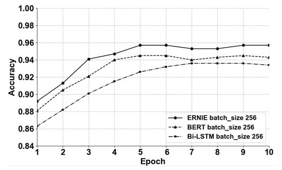 In the experiment, the different models were used to learn the training corpus. The specific training parameters of BERT and ERNIE are shown in Table 2, with a total of 12 layers and a hidden layer of 768 dimensions. The 12-head model was used (Table 2), with a total of 110 million parameters. Next, the optimized different models were used to evaluate the test data separately, as shown in Figure 6. The ERNIE model archived best the performance of accuracy with increments of the epoch.