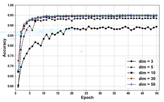 Accuracy of Epoch with different dimensions of FastText model (-ngrams = 2; learning rate = 0.01; neg = 10).
