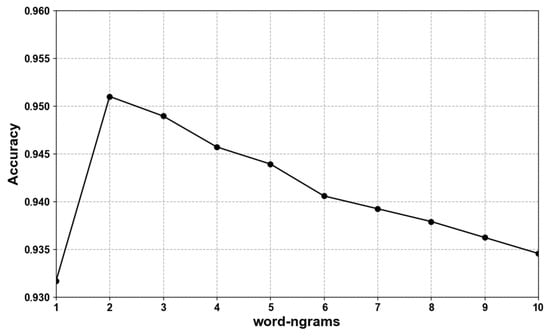 One million online real customer service chat corpora were used for distillation. The teacher model was used to obtain the tags, and next the student model FastText was distilled. We conducted several FastText experiments with different dimensions, as shown in Figure 7, where the accuracy increased with larger dimension numbers. The best performance of accuracy reached 0.95, which did not surpass the teacher model ERNIE in its accuracy of 0.957. In addition, the experiments of different word-ngrams was also conducted, as shown in Figure 8. This experiment showed which word-ngrams reached the best accuracy performance of 0.951, of which there were two.