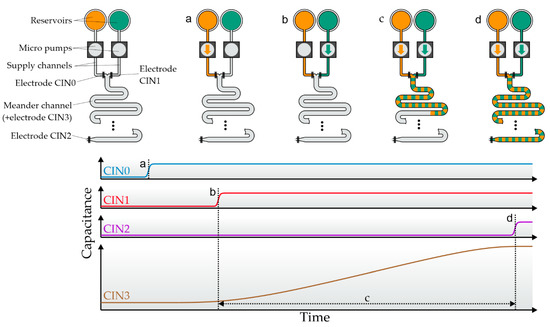 Schematic flow process and capacitance measurements during a complete dosing process in one meander. Four electrodes are used for fluid control, named CIN0 and CIN1 (at the end of the supply channels), CIN2 (at the end of the meander), and CIN3 (which covers the complete meander, not depicted). (a) Filling of the first supply channel. Filling is completed when digital electrode CIN0 detects fluid. (b) The second supply channel is full when CIN1 is triggered. (c) Alternating pumping. The capacitance of the main meander electrode is used to switch between the pumps. The capacitance gain caused by each pump is saved for later analysis. (d) The process finishes when CIN2 is triggered.