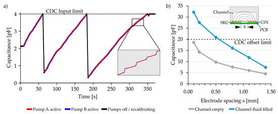 (a) Capacitance data measured by the “meander” electrode. The capacitance rises as fluid is pumped into the meander channel. The capacitance induced by each pump is used to determine when to switch the pumps. The insert shows exemplary data in more detail. The “blue” pump has a higher flow rate; therefore, the capacitance rises quicker when the blue pump is active. Recalibration steps are performed just before the meander capacitance reaches a value of 4 pF (=216 counts). The recalibration moves the active sensor range by internally subtracting a capacitance offset and moving the measured capacitance back towards the bottom of the ±2 pF sensor range, thus increasing the high-resolution sensing range of the system. (b) Simulation data showing the capacitance of empty and full meander channels for variations in the electrode spacing s between the excitation electrode (SRC) and the measurement electrode (CIN). If is smaller than 0.6 mm, then the capacitance of the associated meander electrode exceeds the CDC capacitance offset limit (dotted line) and hence the sensor range when the channel is filled with fluid. For the final system, an electrode spacing of s = 0.8 mm was chosen.