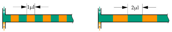 Visualization of different fluid packet sizes inside the microchannel. Of course, the zebra stripe pattern is for illustration purposes only and will not be present in reality due to mixing effects and diffusional transport.