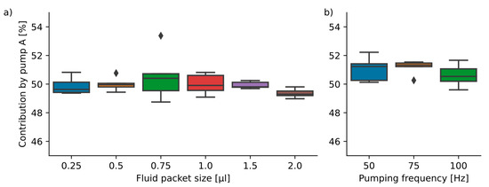Since both pumps A and B should contribute equally to the overall dosed volume in the packet size and pumping frequency variation, the expected contribution of pump A to the total dosed volume should be 50%. This is also reflected by the capacitive measurements, which indicated a mixture of 50.0 ± 0.1% (all results given as mean ± std) across all 45 experiments. The gravimetrically measured average mixing contribution of pump A across all experiment iterations was 50.3 ± 0.9%. Figure 6 shows a boxplot of the packet size variations (a) and the pumping frequency variations (b). The dosing time necessary to fill the complete meander continuously decreases from an average of 408 s (0.25 µL packets) to 247 s (1.5 µL packets).