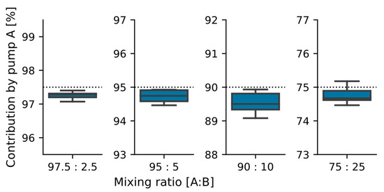 Dosing results for biased mixing ratios (n = 4 ∗ 5). The target dosing ratio for pump A is shown in the plots as a dotted line. The mean and standard deviations are: 97.5: 97.3 ± 0.1%; 95: 94.7 ± 0.2%; 90: 89.5 ± 0.3%; and 75: 75.8 ± 0.3%. The overall deviation from the targeted mixing rate for all n = 20 data points is 0.3 ± 0.3%.