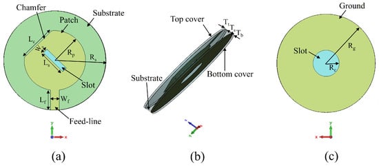 Geometry of the proposed flexible and transparent CP antenna: (a) top view, (b) side view, (c) bottom view.