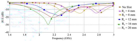 The effect of the radius of the slot of the ground plane on the resonance characteristics of the antenna is illustrated in Figure 3, which shows that resonance frequency shifts with the change of the slot radius.