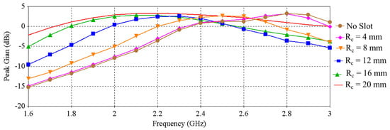 Peak gain vs. frequency when varying the radius of the slot of the ground plane.