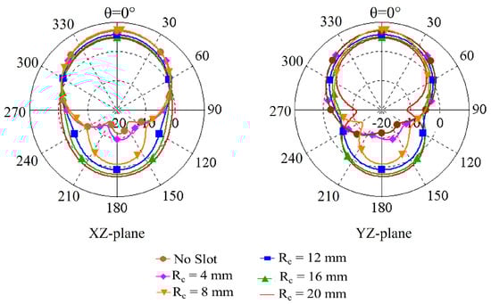 Radiation patterns (in dB) at the corresponding resonance frequencies when varying the radius of the slot of the ground plane.