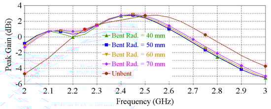 The demonstrated antenna is conformal, which means that it can undergo bending that is crucial for wearable applications. To assess the RF performance of the antenna under bending, the antenna was simulated when bent as shown in Figure 7. “Bent Rad.” denotes the bending radius of the antenna. Figure 8 and Figure 9 show the and peak gain of the antenna for different bending radii ranging from 40 to 70 mm. It can be noted that the resonance frequency of the antenna is shifted slightly towards lower frequency as the bending radius decreases. Nevertheless, the target frequency of 2.4 GHz is still covered with a good matching and satisfactory gain. These numerical investigations show that the antenna is resilient against physical deformation, validating the suitability of the antenna for wearable applications.