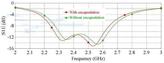 Lastly, Figure 10 and Figure 11 show the impacts of PDMS encapsulation on the resonance frequency and peak gain of the antenna, respectively, demonstrating that the thin (0.2 mm) PDMS encapsulation has an insignificant effect on the antenna performance.
