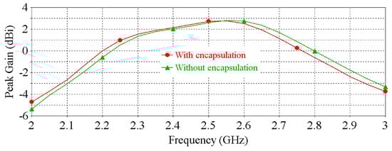 The effect of the PDMS encapsulation on the peak gain of the antenna.