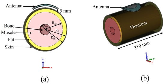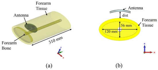 Antenna on top of the forearm phantom: (a) perspective view, (b) cross-sectional view.
