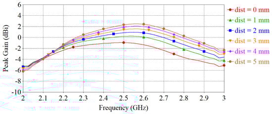 Peak gain vs. frequency when varying the separation between the antenna and phantom.