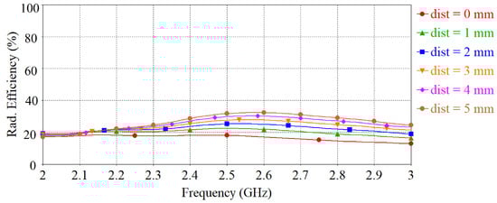Radiation efficiency vs. frequency when varying the separation between the antenna and phantom.