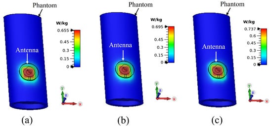 SAR distributions in the forearm phantom at: (a) 2.4 GHz, (b) 2.45 GHz and (c) 2.6 GHz.