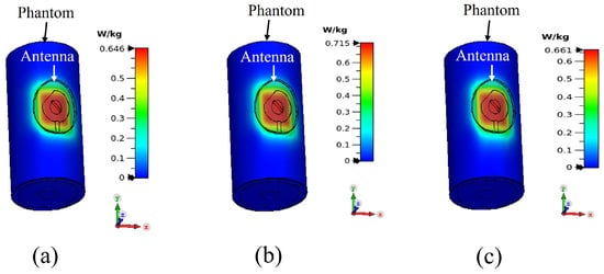SAR distributions in the multilayer phantom at: (a) 2.4 GHz, (b) 2.45 GHz and (c) 2.6 GHz.