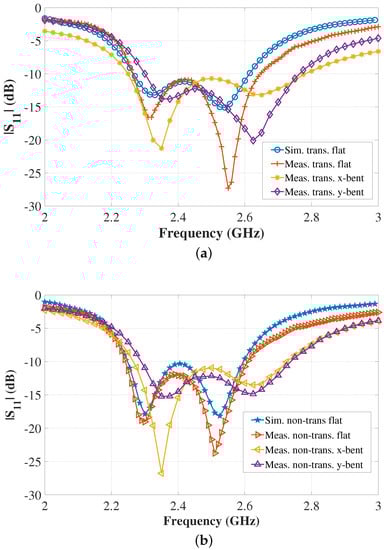 The performance of the antenna was experimentally tested in the worst scenario, i.e., when the antenna was directly bent around the wrist of the SPEAG forearm phantom having a circumference of approximately 15 cm. The prototype was bent in two principal planes, i.e., x-axis bent and y-axis bent. These tests were conducted for both the transparent and non-transparent antennas, and the performances were compared.