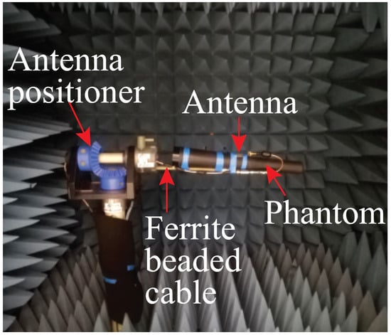 The return loss () measurements were accomplished by using an MS2038C Vector Network Analyzer (VNA) from Anritsu. The photos of the measurement set-ups of the antenna are shown in Figure 21. The antenna was fed with a 50-Ω coaxial line through a 50-Ω SMA connector. A ferrite bead was incorporated into the measurement set-up to minimize the ground current flow to the feed cable, which may affect the antenna’s measured impedance and radiation characteristics. The measured and simulated results are displayed in Figure 22. From Figure 22, it can be seen that the measured results of the free-space case agree well with the simulated results, demonstrating a satisfactory matching ( < 10 dB) for both transparent and non-transparent antennas at the target frequency 2.4 GHz. In simulations, as the result of the differences in the characteristics of the conductive materials, it was observed that both antennas in flat free-space case exhibit slightly different input impedance, i.e., 81.6-j17.7 Ω for the transparent antenna and 84.3-j23.5 Ω for the non-transparent counterpart. The discrepancy between the simulated and measured results are most likely due to the fabrication tolerances, such as during patch and ground plane layering over PDMS layers and the antenna-SMA interconnection using conductive epoxy. The 10-dB return-loss bandwidth is around 346 MHz for both the transparent and non-transparent antenna. It can also be observed from the on-phantom results in Figure 22 that the resonance frequency and impedance matching of the antennas are affected by the phantom proximity and bending. Nevertheless, the antenna still operates within the desired band with satisfactory impedance matching, which demonstrate the antenna’s robustness against human body loading and physical deformation.