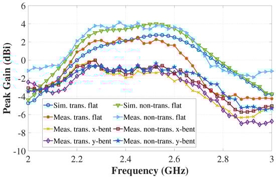 Simulated and measured peak gain vs. frequency of the transparent and non-transparent antennas.