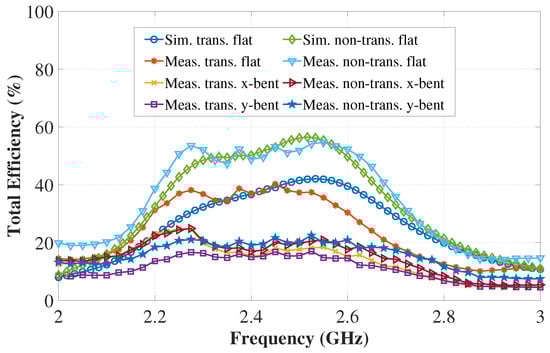 The simulated and measured total efficiency of the antennas are depicted in Figure 25. It can be seen that, in free-space, the transparent antenna has a measured maximum total efficiency of 42.26%, and the non-transparent antenna has a measured maximum total efficiency of 54.64%. The reduced efficiency of the transparent antenna is attributed to the higher sheet resistance of the transparent fabric. When bent over the phantom, the antenna efficiency decreases due to the power loss in the phantom as described before. By keeping a distance between the antenna and phantom, the antenna efficiency can be improved as can be seen in Figure 16.