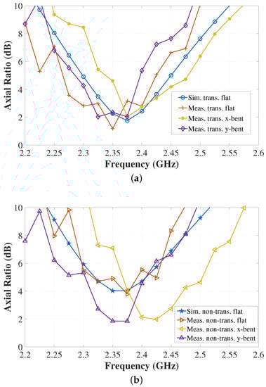 Simulated and measured axial ratio vs. frequency: (a) transparent antenna, (b) non-transparent antenna.
