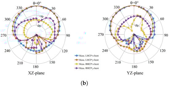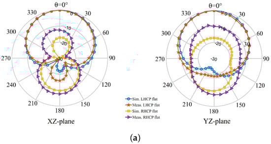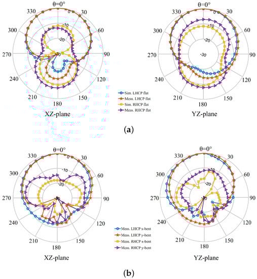 Simulated and measured far-field radiation patterns of the non-transparent antenna at 2.4 GHz: (a) unbent state, (b) bent state.